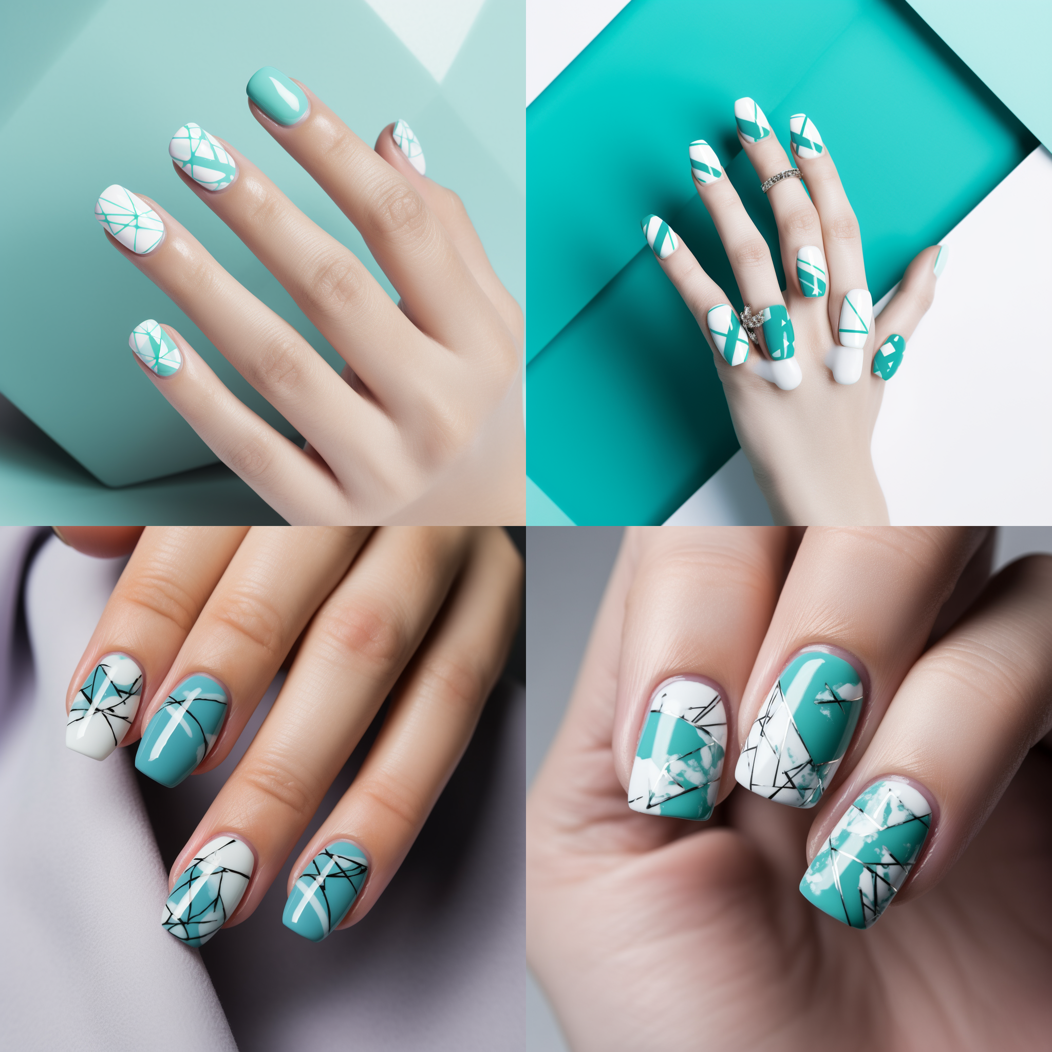 Nail art, cyan, white geometric pattern, minimalism, HD --v 5