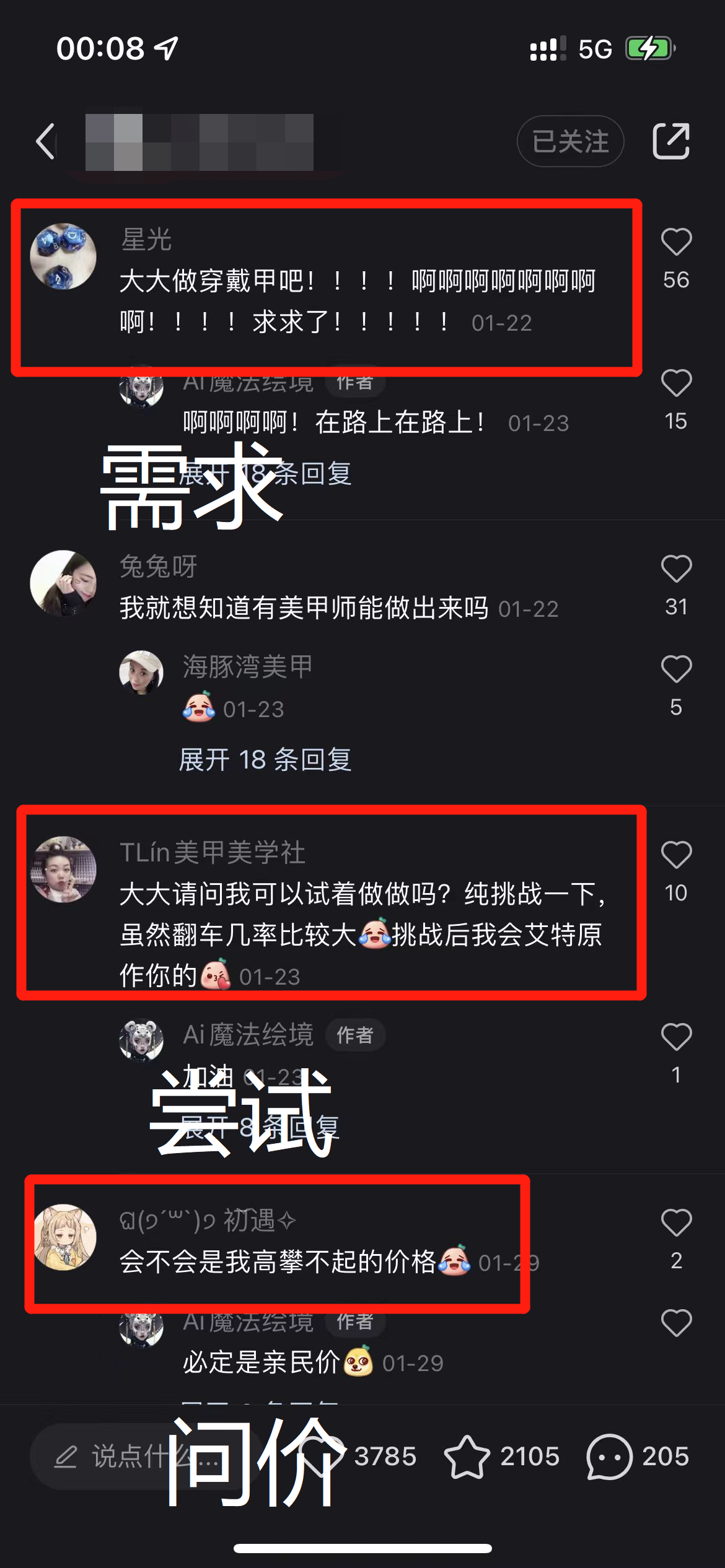 点开爆款笔记可以看到,需求、尝试和问价的人不少,说明这是一个有市场、有需求、可转化的方向。这个账号证明 AI 绘画与美甲的结合是一个有潜力的方向,值得探索。