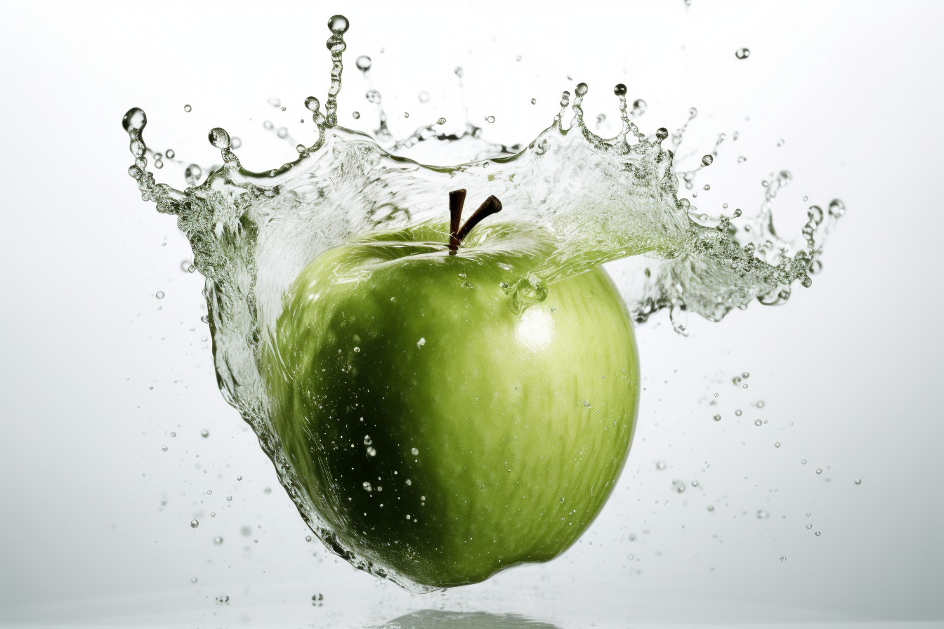 High speed photography, by Harold Edgerton, closeup, green apple falling into water, splash, studio light, white background, best quality --ar 3:2 --v 5