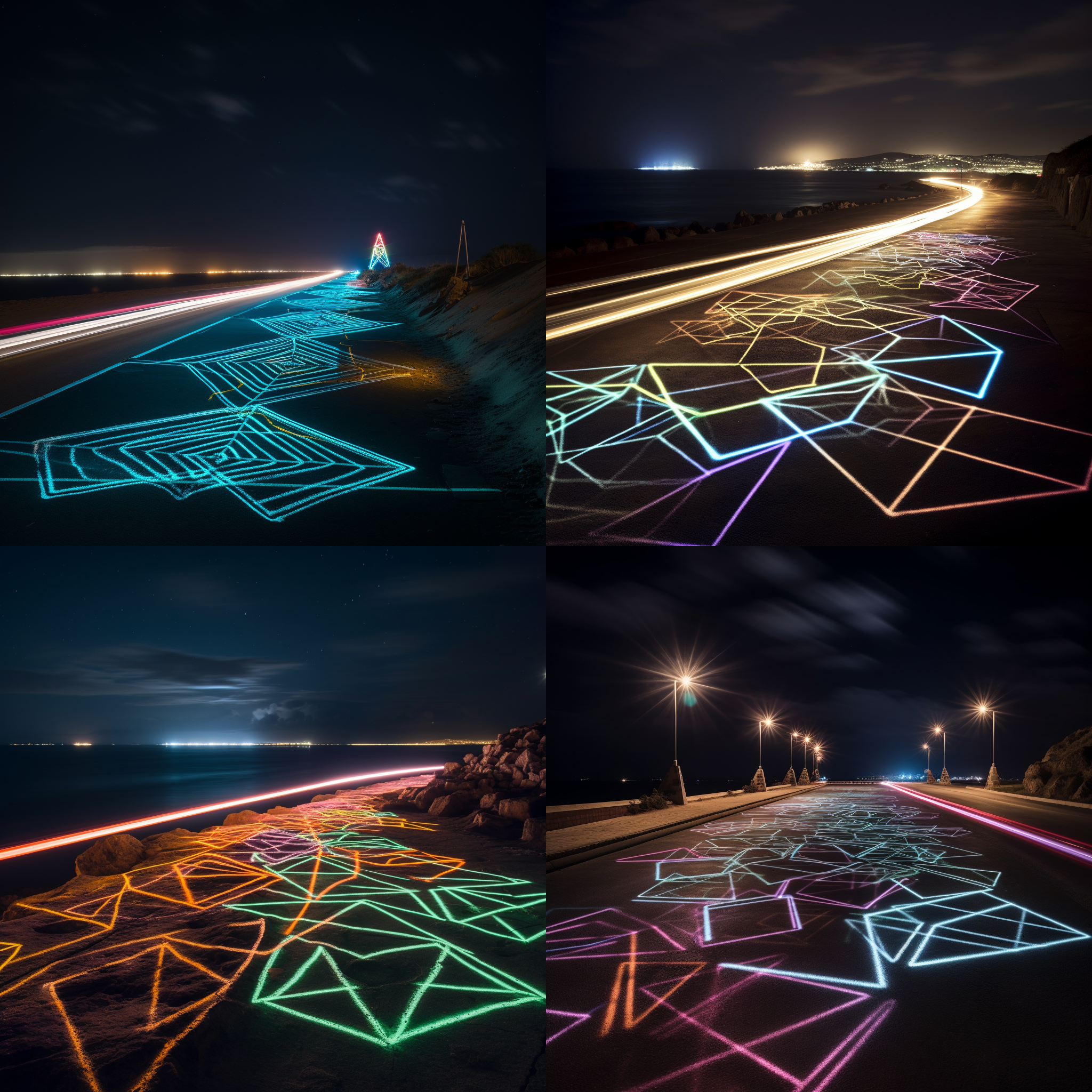 Light graffiti, seaside roads, geometric shapes --v 5