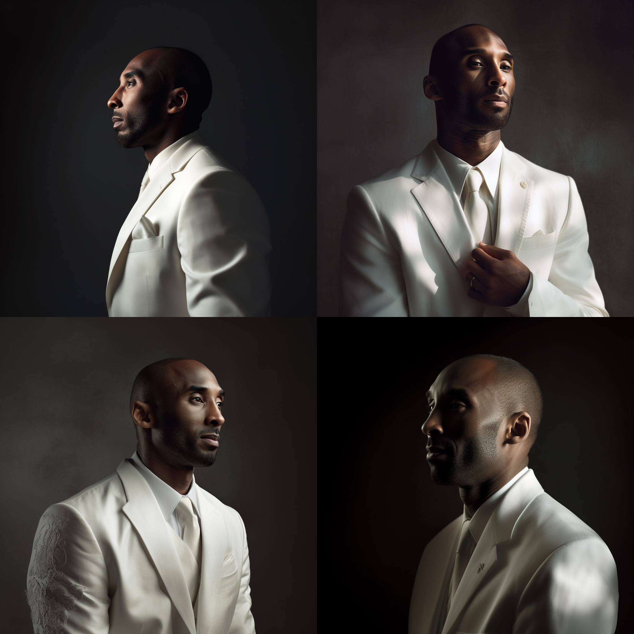by Annie Leibovitz, portrait photography of Kobe Bryant in white suit, upper body close-up, color, interior, studio lighting, best quality --v 5