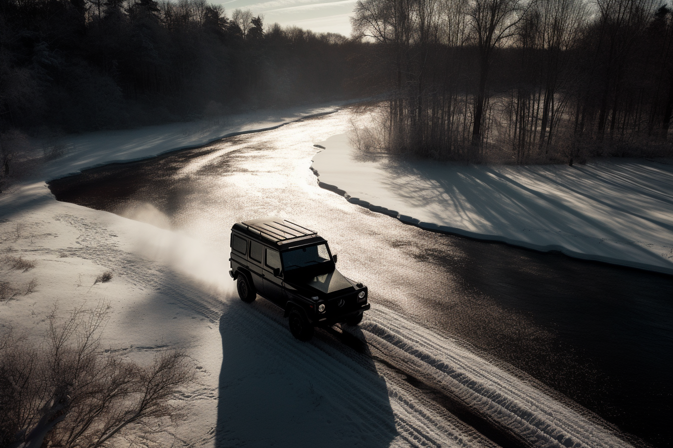 Aerial photography, by Cecil Beaton, black Mercedes G50, driving on a frozen lake, surrounded by forest, natural light, chiaroscuro, best quality --ar 3:2 --v 5